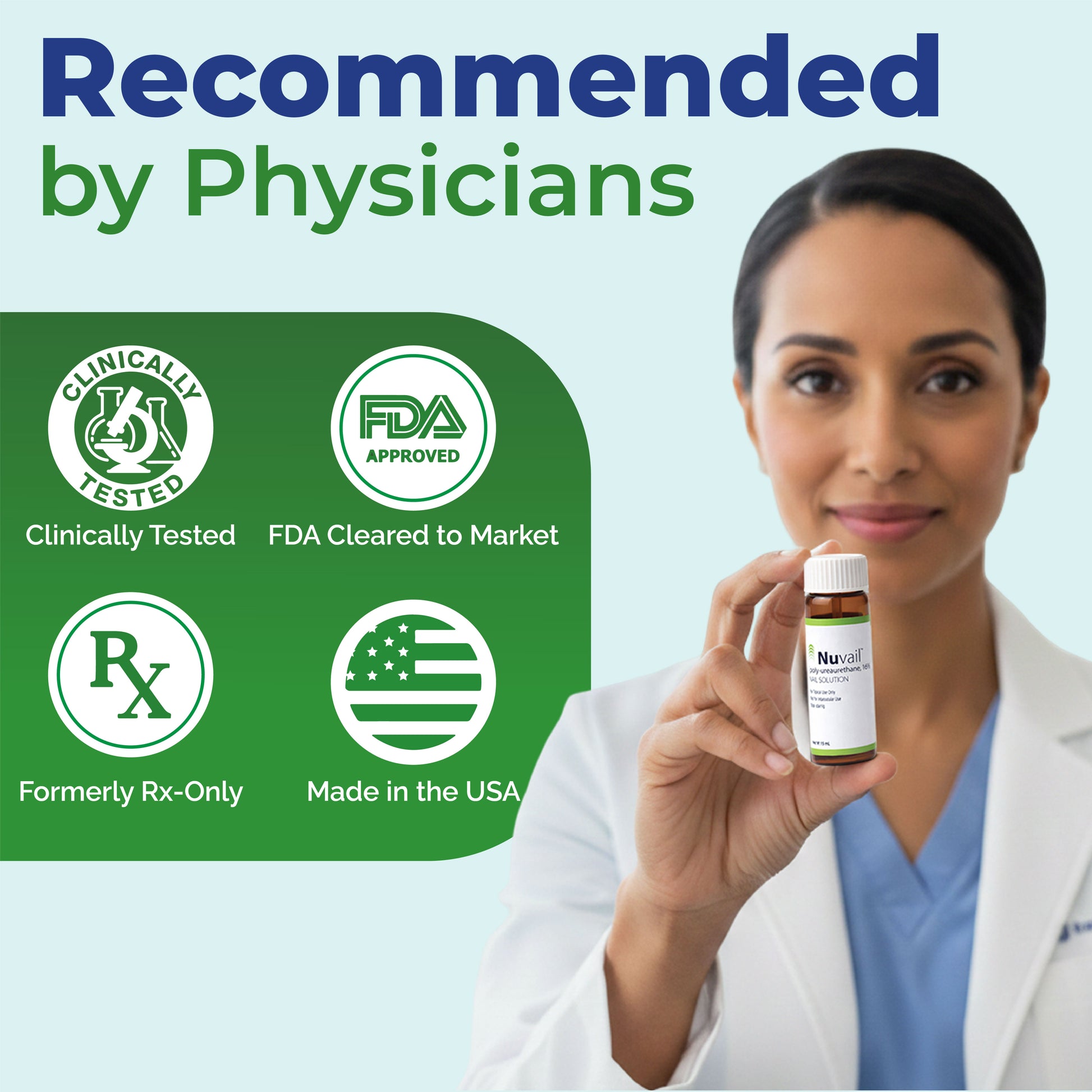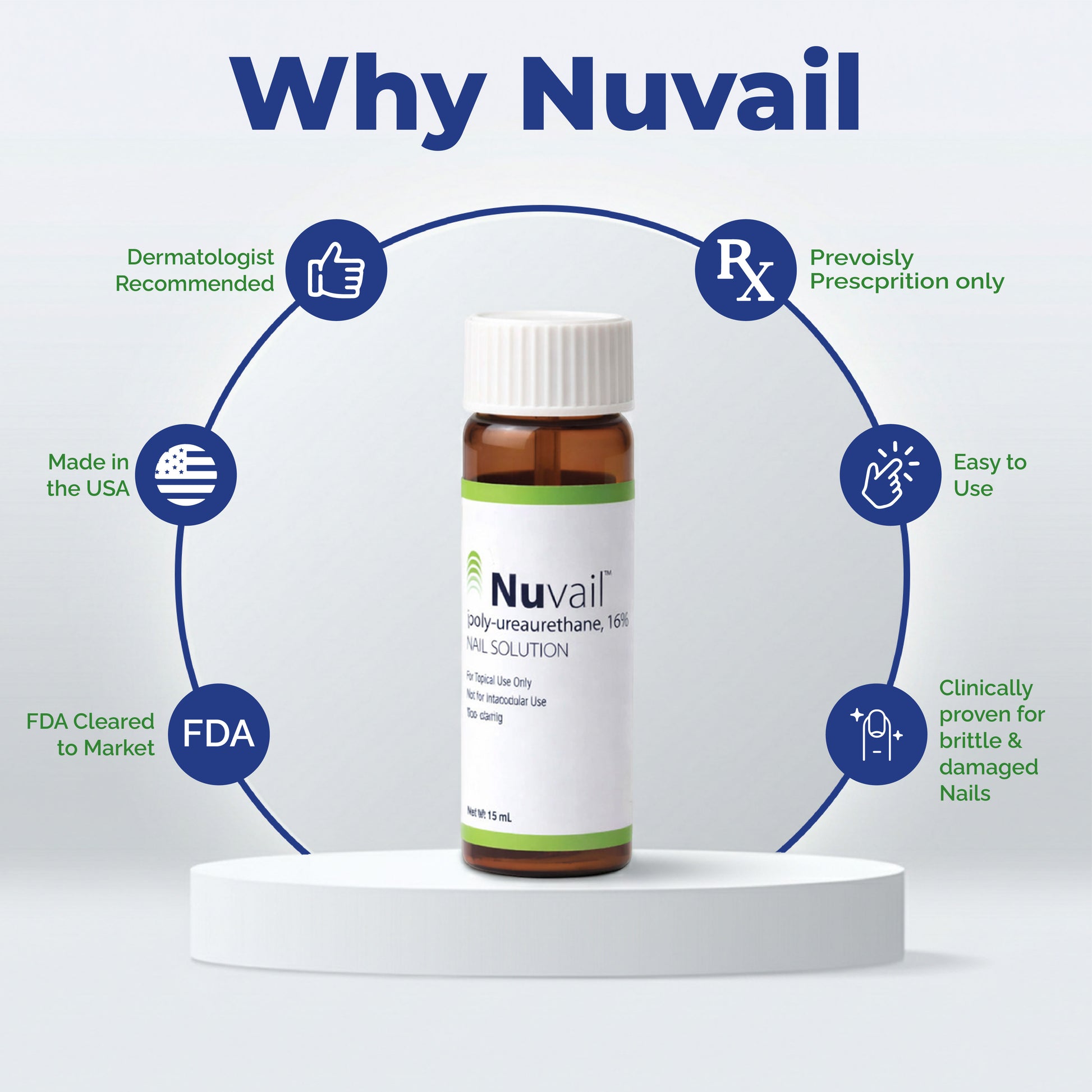 Previously only available by prescription and cleared by the FDA, Nuvail ™ (poly-ureaurethane, 16%) is a unique, patented polymer that leaves a breathable, elegant, invisible film when applied to nails. Nuvail ™ is indicated for managing signs and symptoms of nail dystrophy, i.e., nail splitting and nail fragility, for intact or damaged nails.